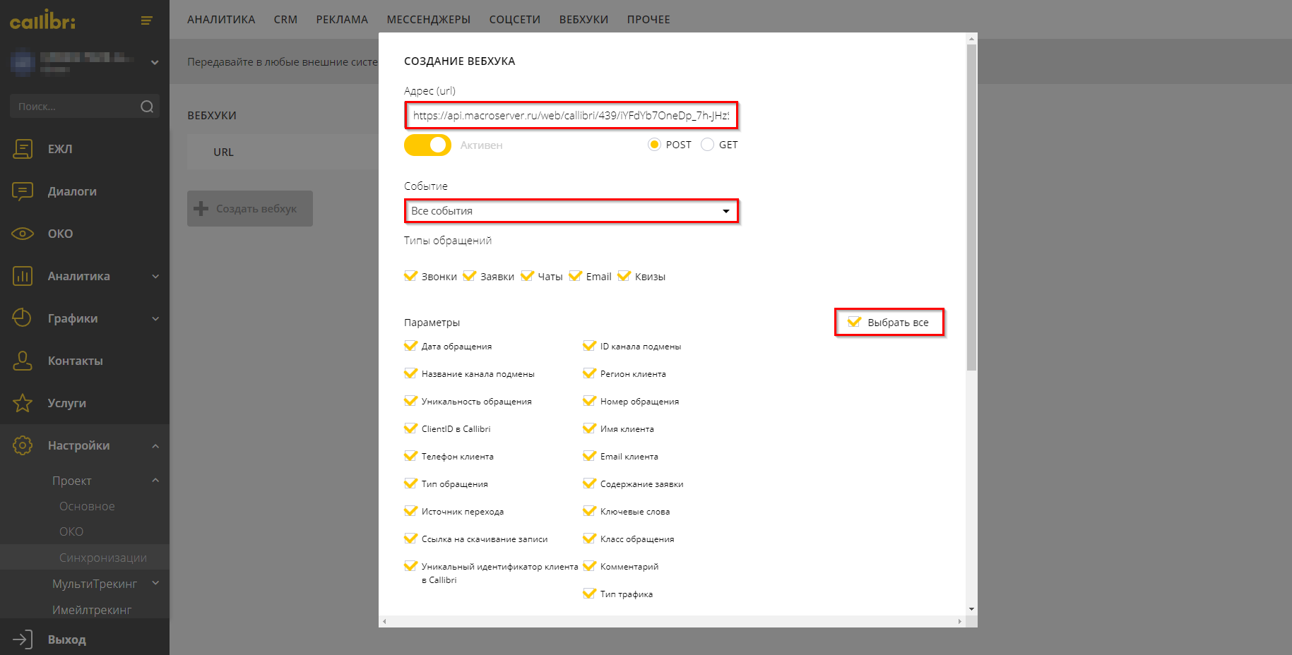 В поле Адрес (url) вставляете ссылку на вебхук, скопированную со страницы интеграции из срм, выбираете Все события и отмечаете галочками параметры, как показано на изображении: