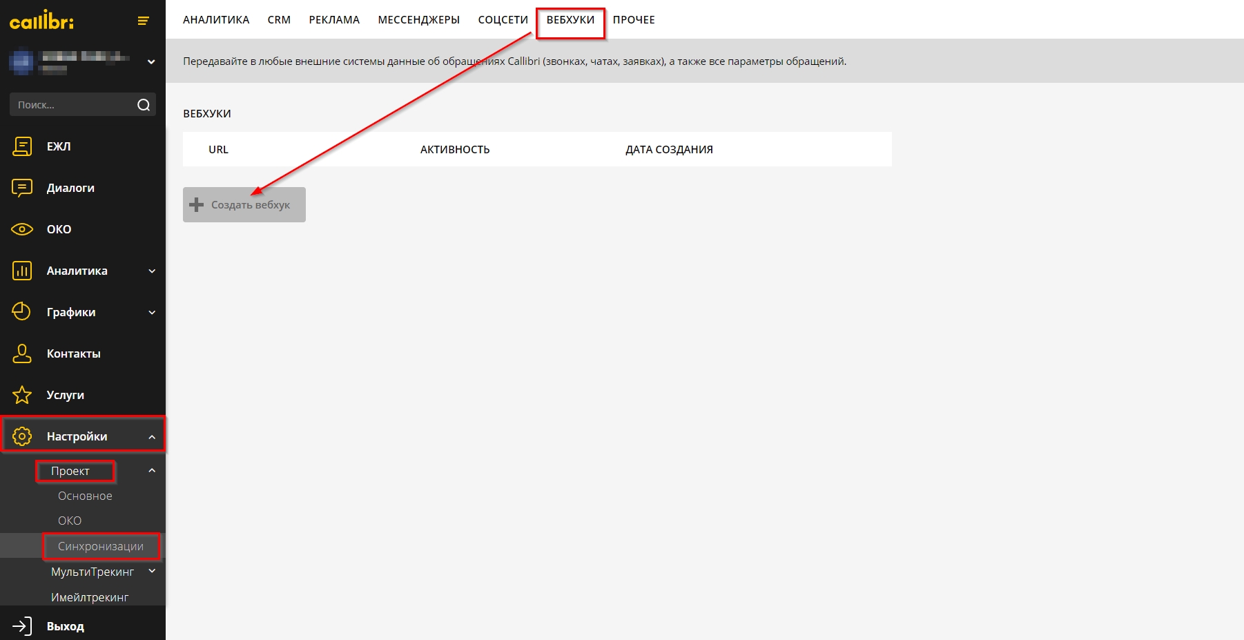 Далее В меню слева открываете Настройки - Проект - Синхронизации. Переключаетесь во вкладку Вебхуки и добавляете Новый вебхук: