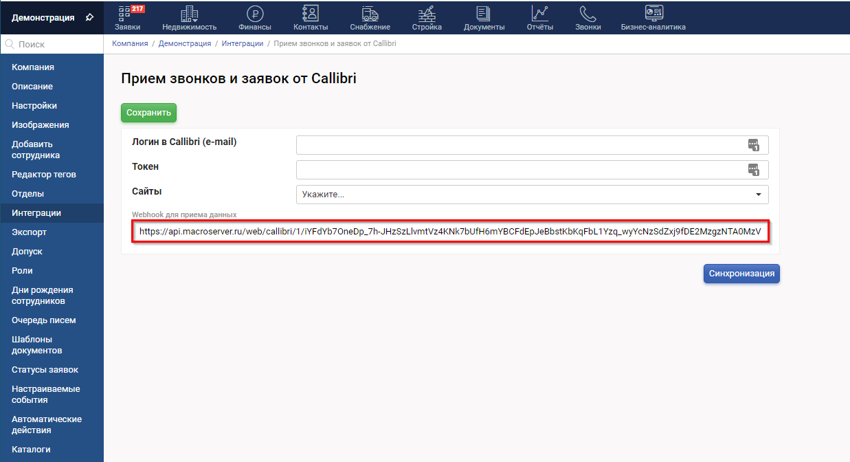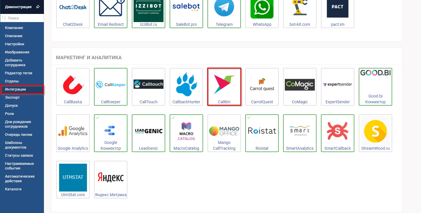 Для подключения интеграции зайдите в раздел Компания - Интеграции - Callibri