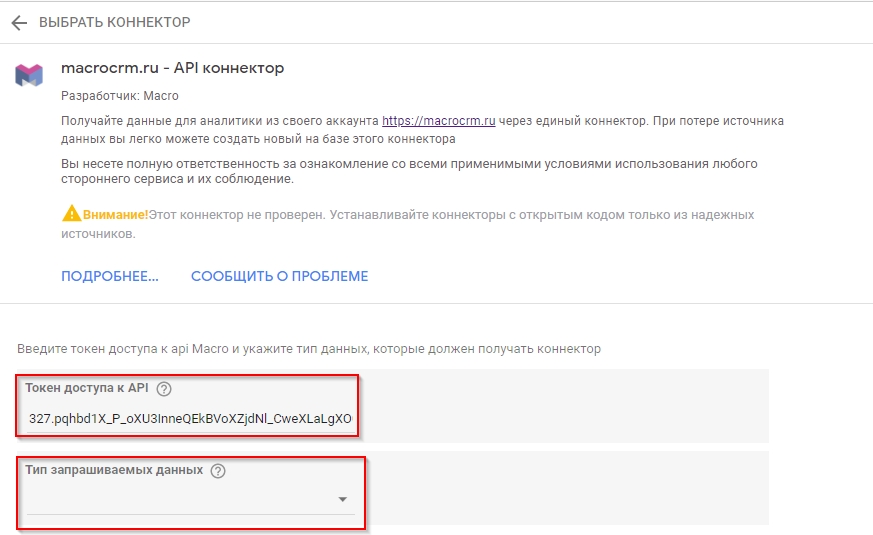 Скопируйте Токен доступа и перейдите по ссылке на коннектор