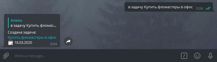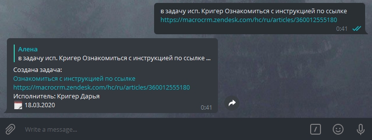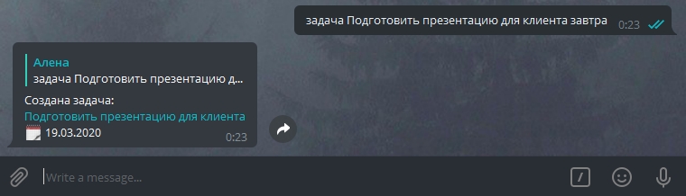 Текст, следующий за ключевой фразой, распознается как суть задачи. Таким образом, Вы создадите задачу, в которой сами же и будете являться исполнителем. Срок исполнения этой задачи будет назначен на сегодня. В ответ бот пришлет сообщение со ссылкой на созданную задачу: