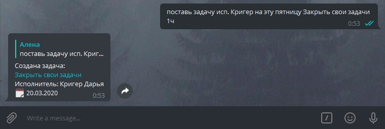Следующее слово распознается как фамилия сотрудника, и бот назначит задачу на него, о чем проинформирует и его, и Вас в личной переписке: