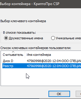 Далее возле поля "Имя ключевого контейнера" жмем "Обзор", из списка выбираем нужный нам контейнер (из реестра подтягивается автоматически, с диска виден только если каталог с 6 файлами *.key лежит в корне любого не системного диска, носителя, и имя каталога имеет вид anything.0000).
