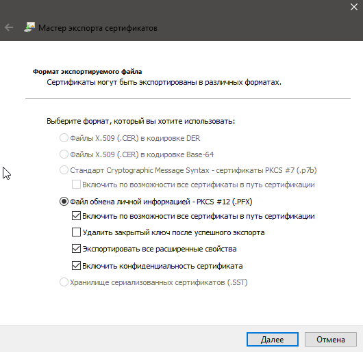 На следующем экране будет доступен только один вариант выгрузки - "Файл обмена личной информацией PKC 12 (.PFX)", здесь же проставляем галки как на скрине.