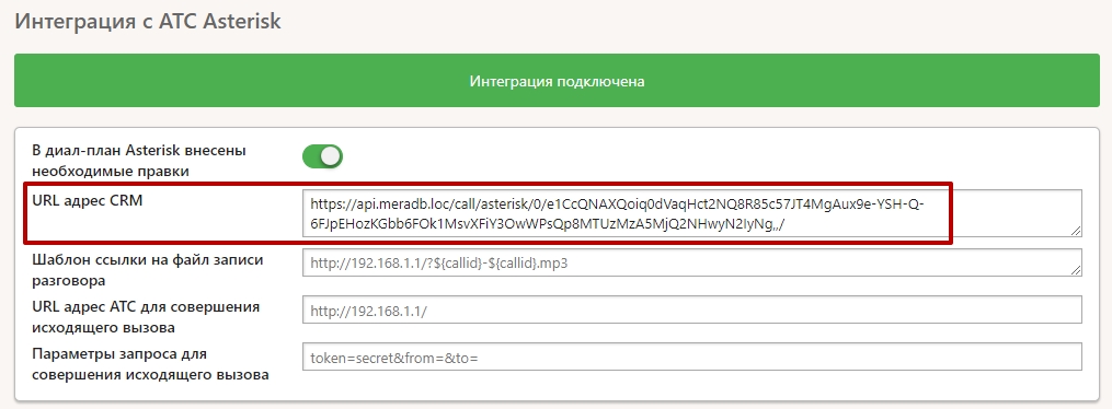 Для приема звонков вам необходимо получить адрес для API запросов в CRM. Данный адрес содержит все необходимые данные для идентификации запроса. Адрес можно получить в разделе Компания - Интеграции - Asterisk