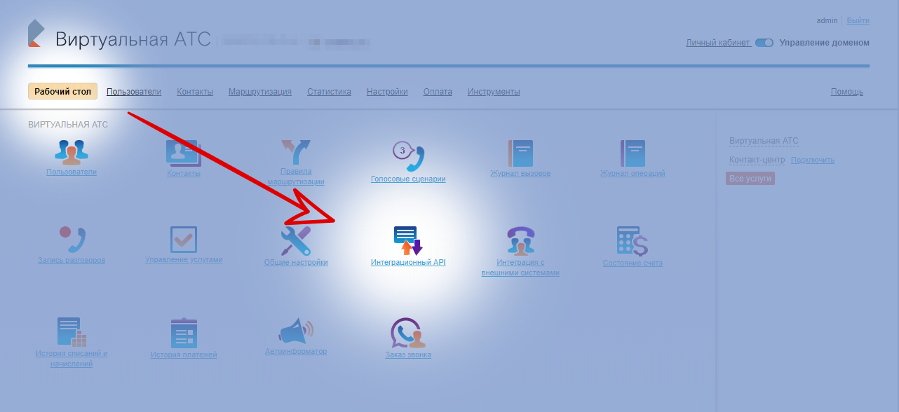 В личном кабинете виртуальной АТС необходимо перейти в Управление услугами → Интеграционный API: