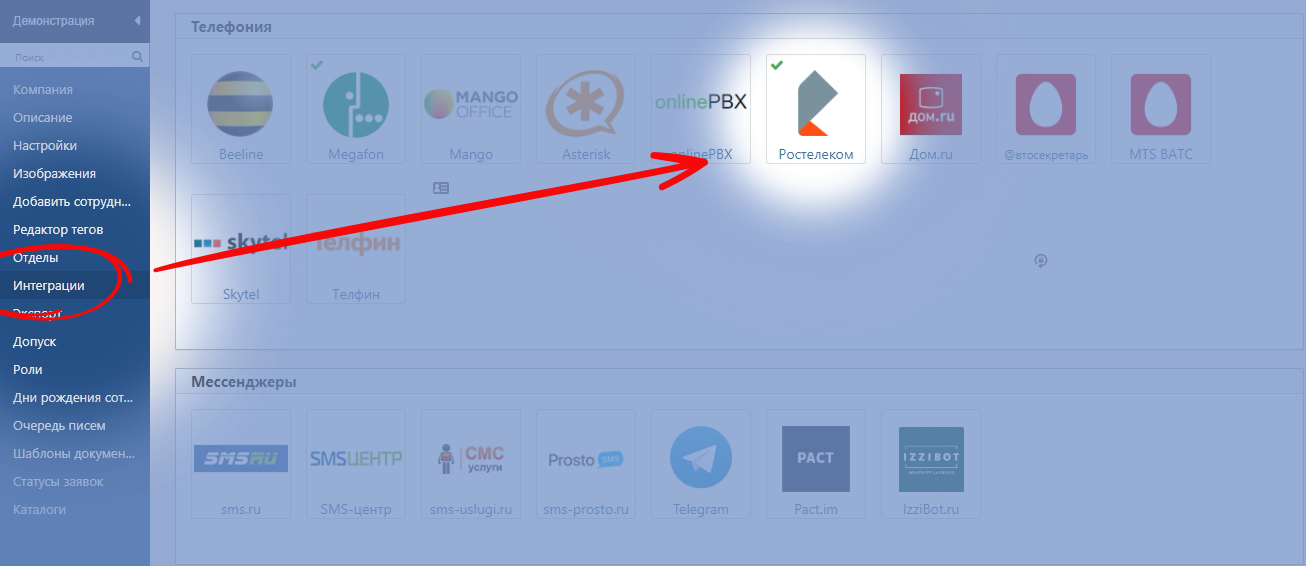 В новой вкладке браузера откройте MacroCRM, зайдите в раздел Интеграции → Телефония → Ростелеком: