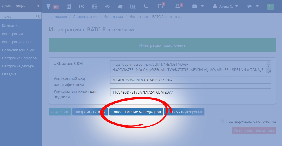 Для отображения менеджера, ответившего на звонок, для совершения обратных звонков по клику из MacroCRM, а также для корректного распределения заявок, создающихся по звонкам, необходимо настроить сопоставление менеджеров в MacroCRM.