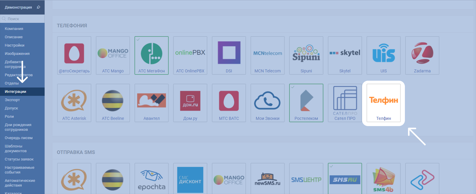 1. Откройте MacroCRM, зайдите в раздел Интеграции — блок Телефония — Телфин: