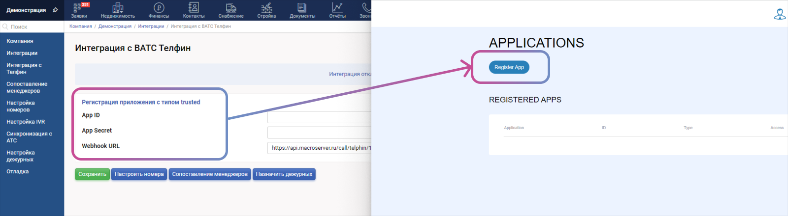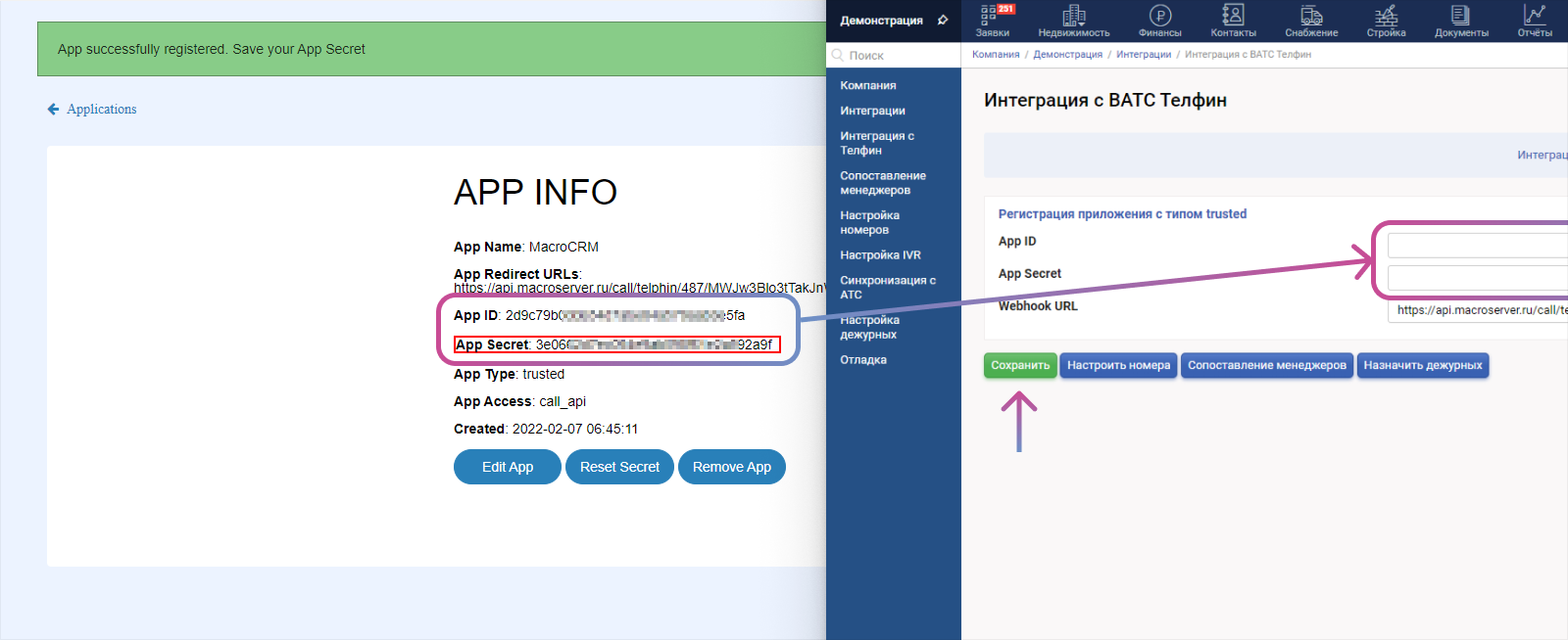 4. После регистрации приложения на странице скопируйте App ID и App Secret в одноименные поля на странице интеграции в MacroCRM и сохраните