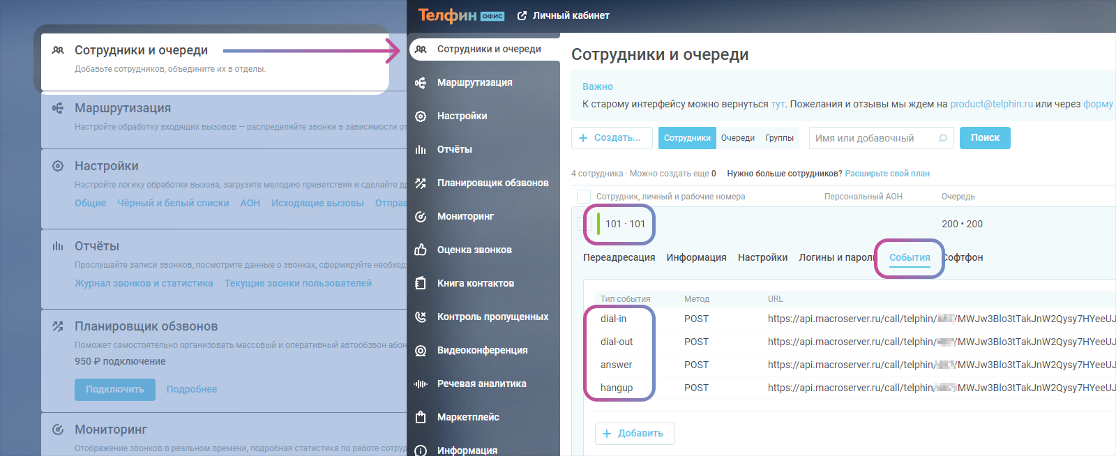 5. В личном кабинете АТС в разделе Сотрудники и очереди для каждого пользователя необходимо добавить все 4 события: