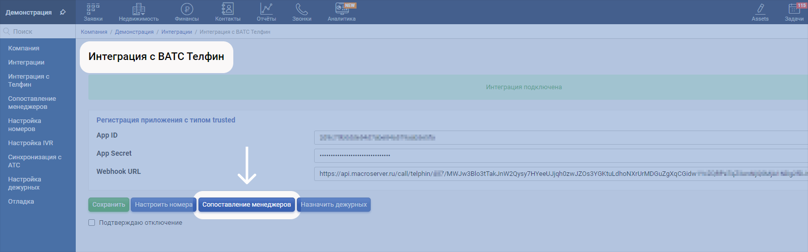 Для отображения менеджера, ответившего на звонок, для совершения обратных звонков по клику из MacroCRM, а также для корректного распределения заявок, создающихся по звонкам, необходимо настроить сопоставление менеджеров в MacroCRM.