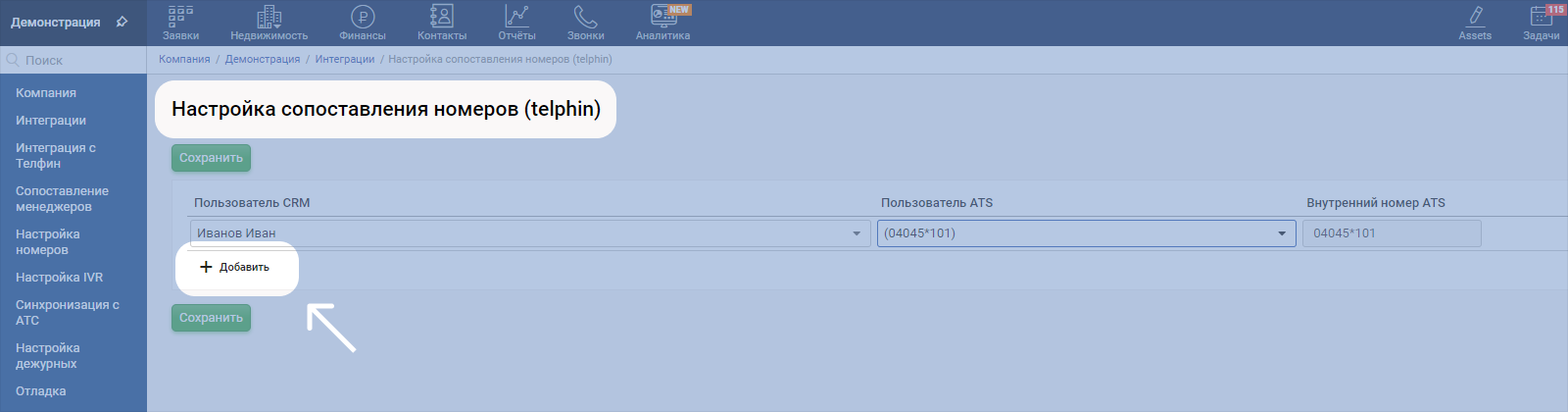 7. Для добавления менеджера нажмите +Добавить. В появившейся строке слева выберите менеджера в CRM, справа пропишите его внутренний номер. Сохраните настройки.