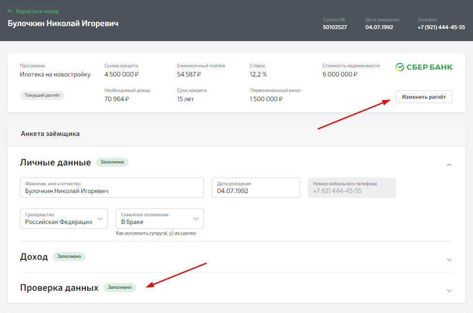 Если вы ранее уже заполняли данные клиента в Сделке или в Карточке контакта, то в Заявку на ипотеку они подтянутся автоматически, вам останется только проверить их и заполнить специальные поля, необходимые для одобрения ипотеки, такие как: