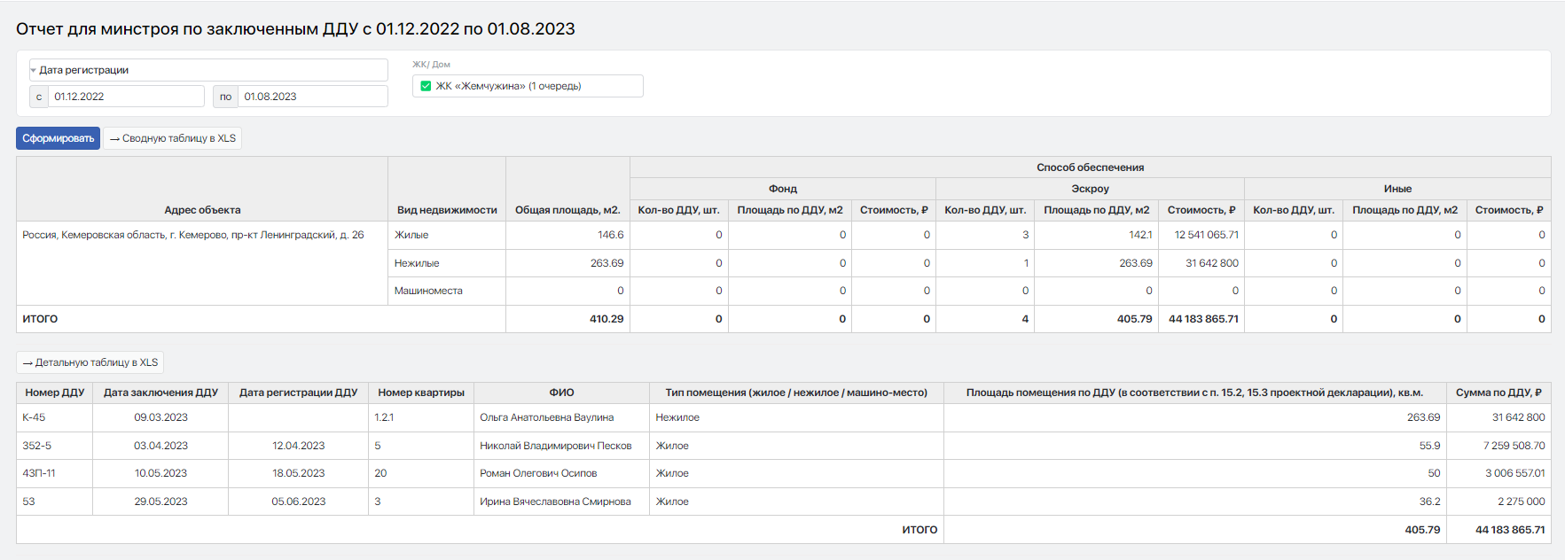 В сводной таблице отображаются суммарные значения по сделкам с разбивкой по способам обеспечения, виду недвижимости и по домам.