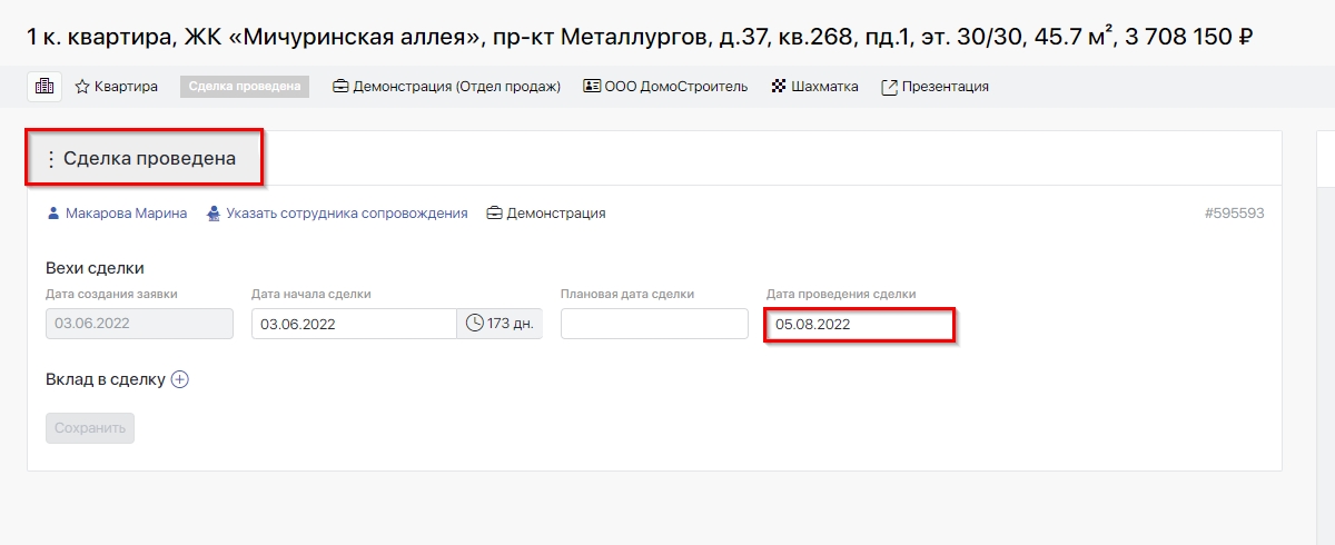 В excel-выгрузку Отчета о скорости проведения сделок добавили столбец Сотрудник сопровождения сделки, выводим в него ФИО сотрудника сопровождения, указанного в сделке.