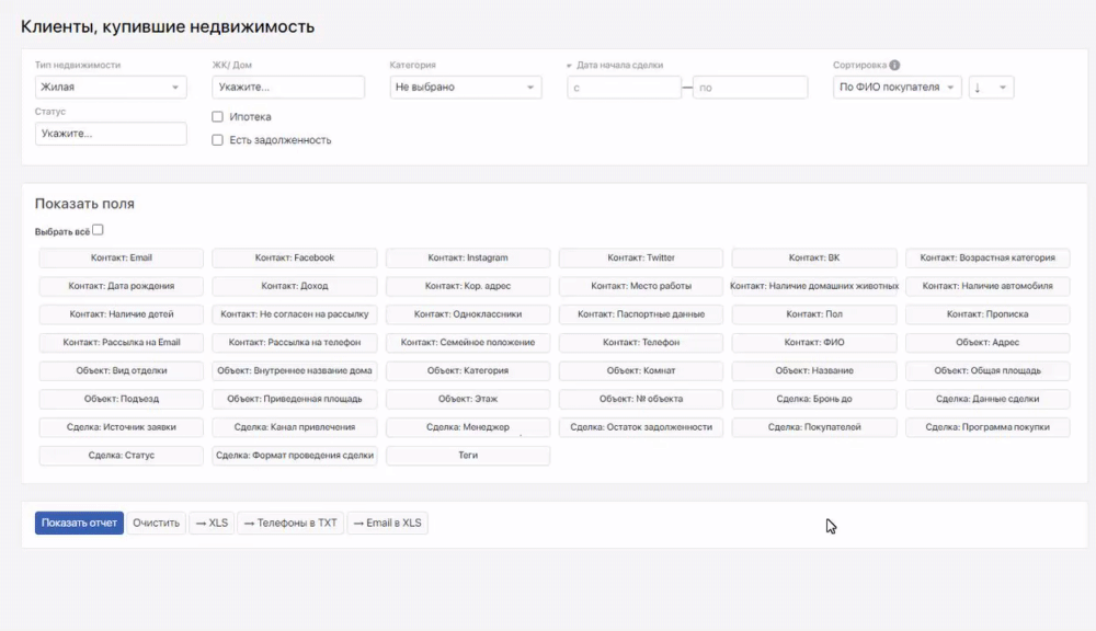 Этот отчет позволяет собрать и показать статистику по клиентам и данным объекта, который он приобрел. При этом здесь есть уникальная возможность — формировать отчет только с теми полями, которые вам нужны.