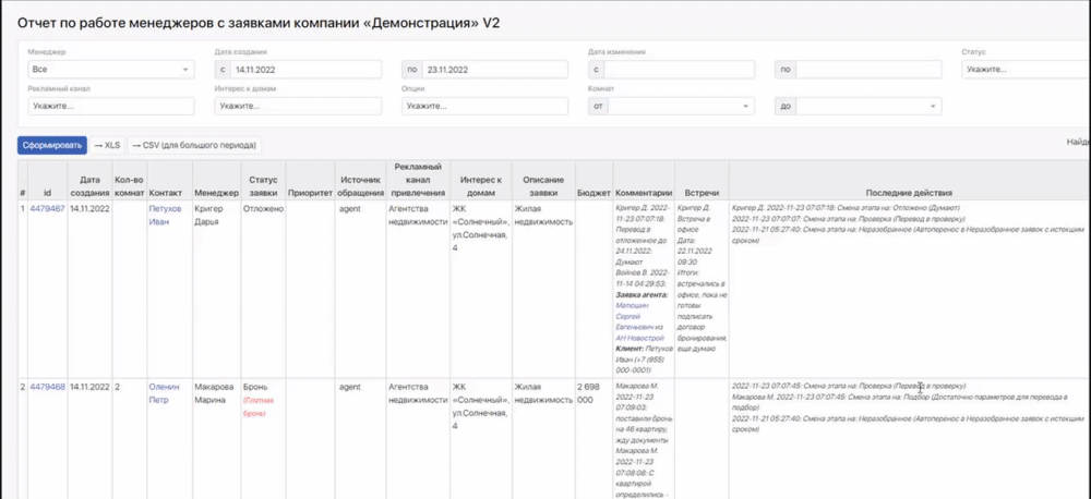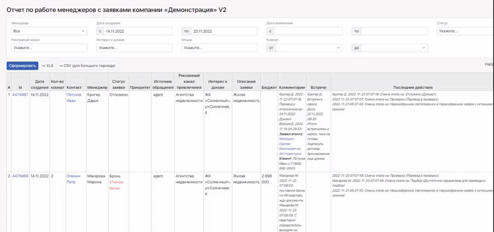 Дополнительные фильтры, такие как Статус, Рекламный канал, Интерес к домам, помогают отследить работу менеджеров по конкретным параметрам заявок. А информация в колонках Комментарии, Последние действия и Открытые задачи дают четкое представление на каком этапе сейчас находится та или иная заявка.