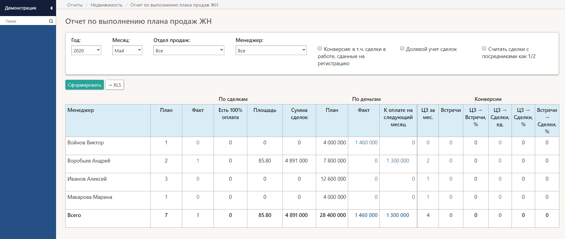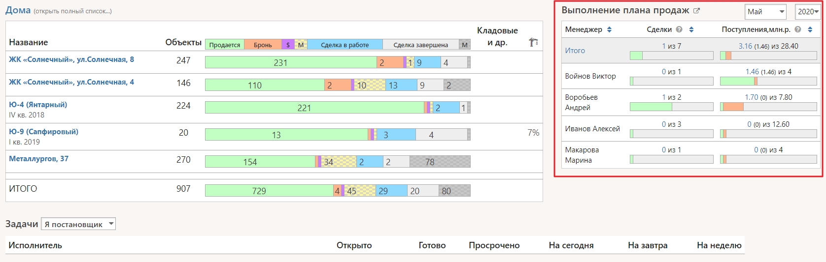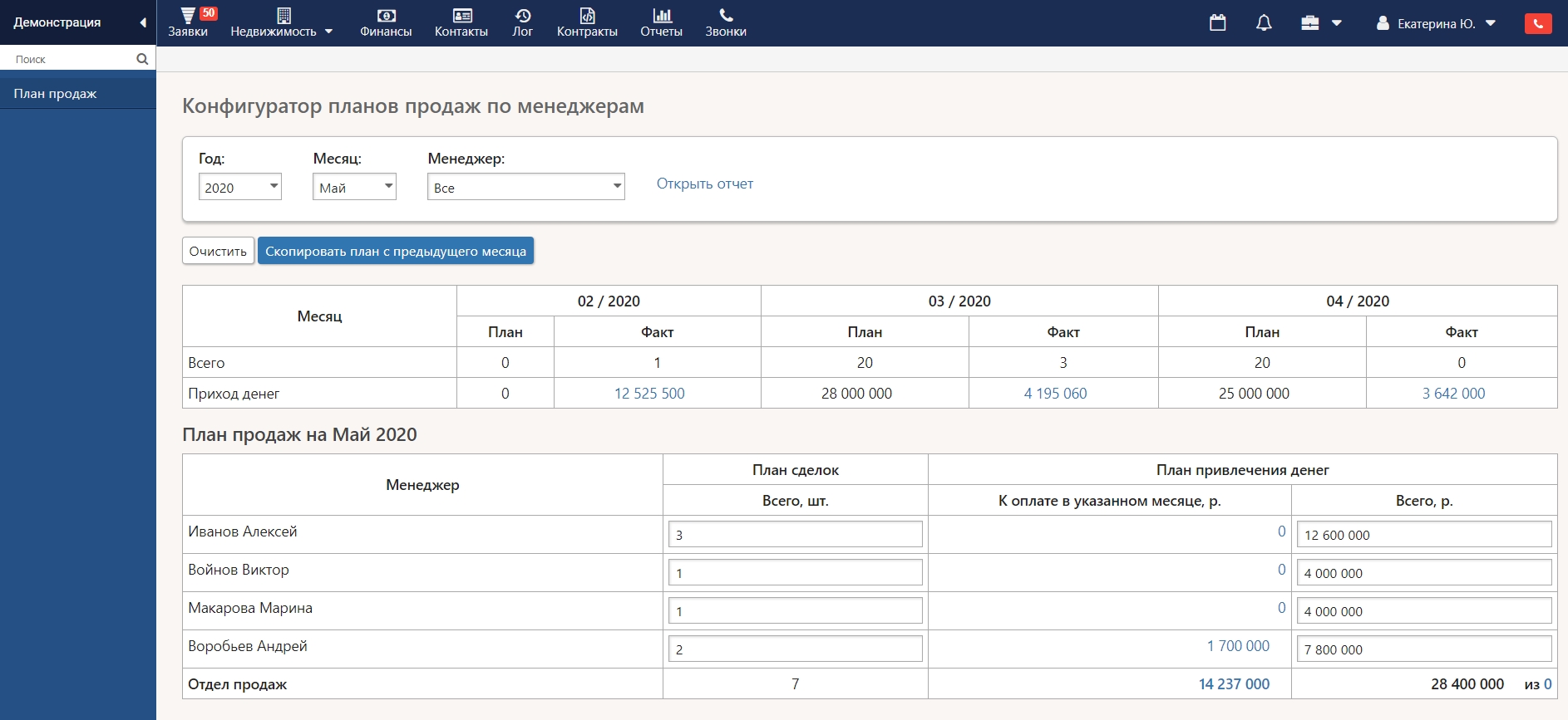 Инструмент позволяет выставлять план продаж в количественном выражении (завершенные сделки) и в финансовом (привлечение денег за месяц) и сравнивать фактические и плановые значения в оперативном режиме.