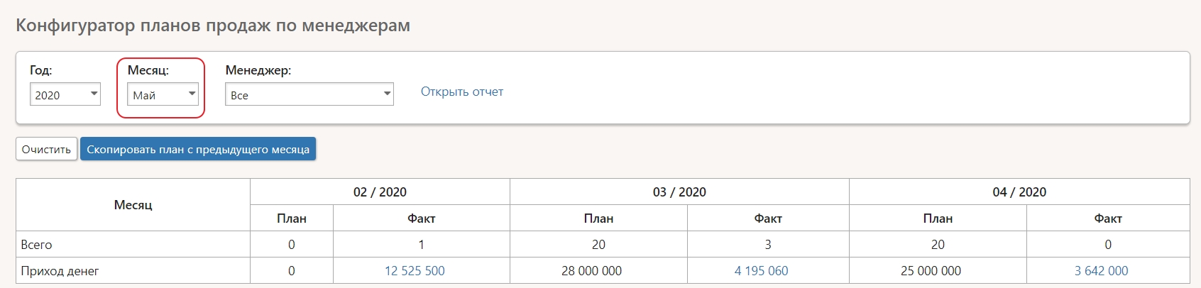 Для установки плана на следующий месяц достаточно выбрать в поле фильтров нужный месяц.