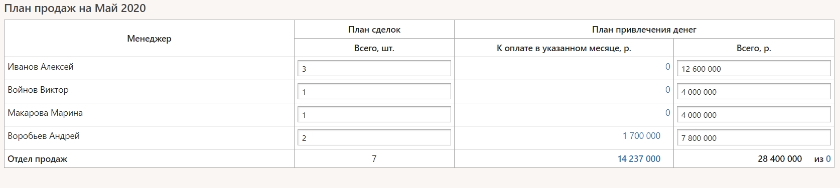 Вторая таблица служит для установки плана сделок и плана по привлечению денег по каждому менеджеру.