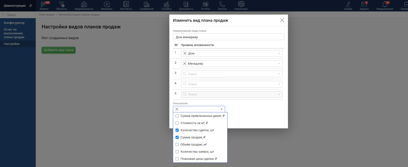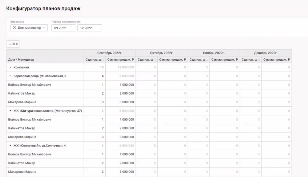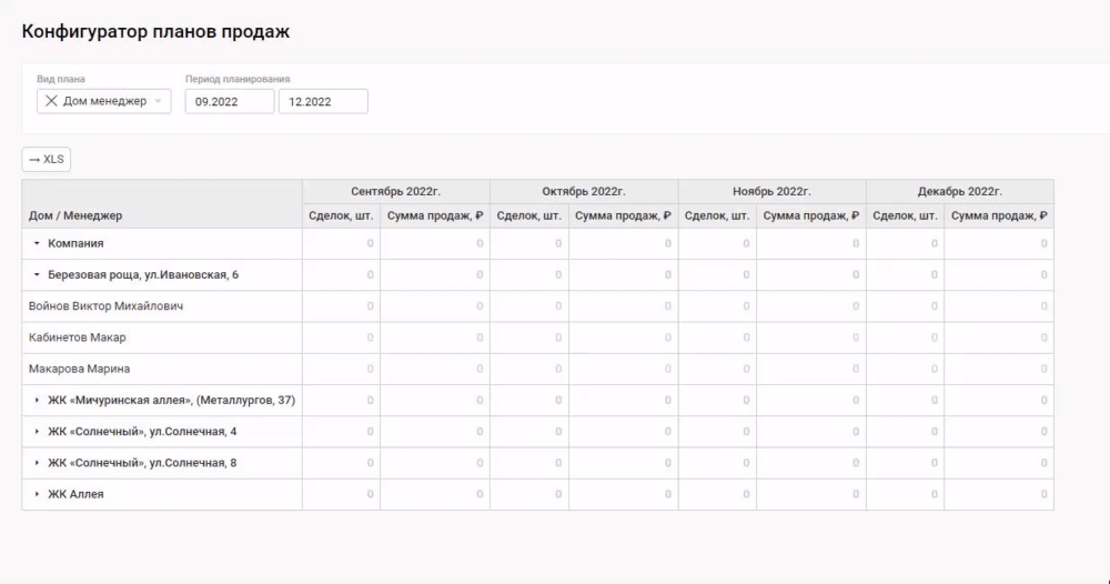 Рассмотрим простой вариант, когда необходимо настроить план продаж по домам и менеджерам. В качестве показателей плана возьмем Количество сделок и Сумму продаж.