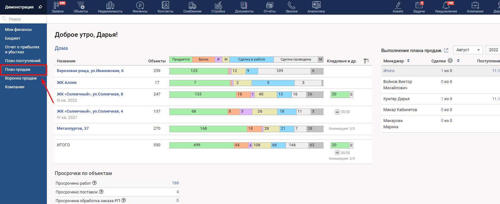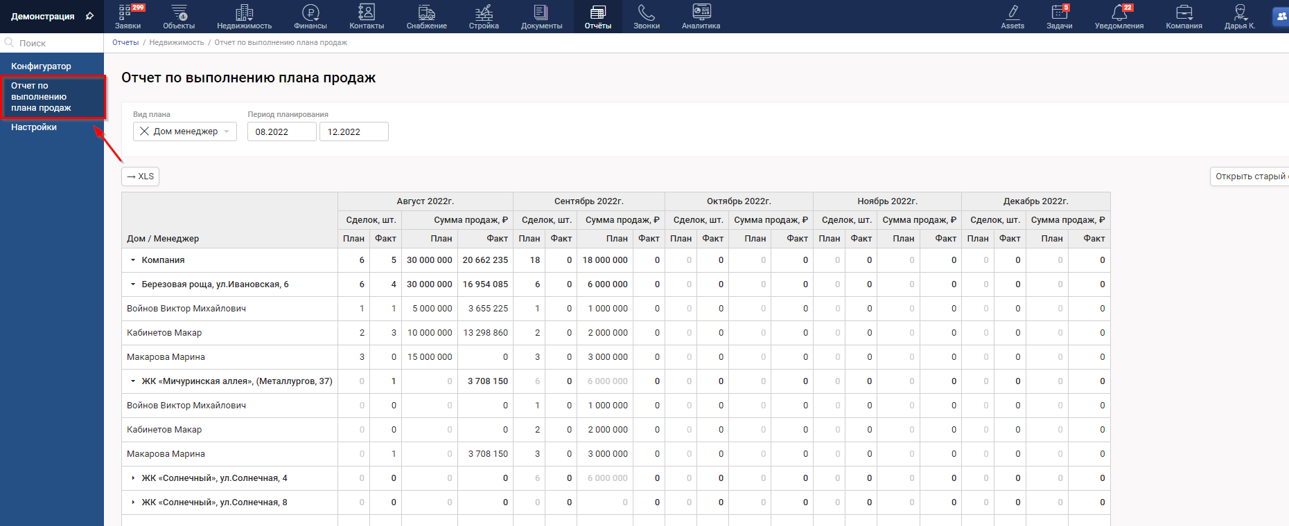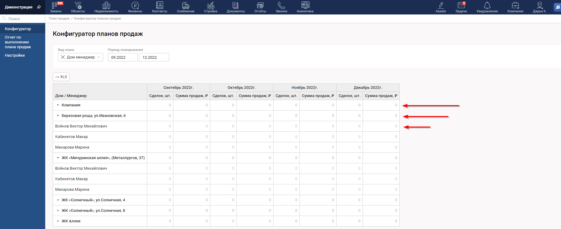 Выбрав в Конфигураторе вид плана, мы видим отображение первой строкой общего плана по выбранным показателям на всю компанию, далее по домам и внутри домов по менеджерам.