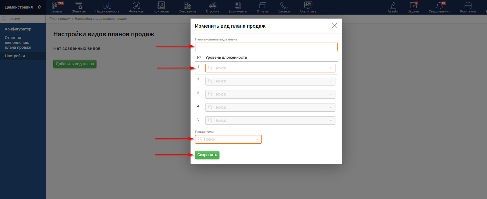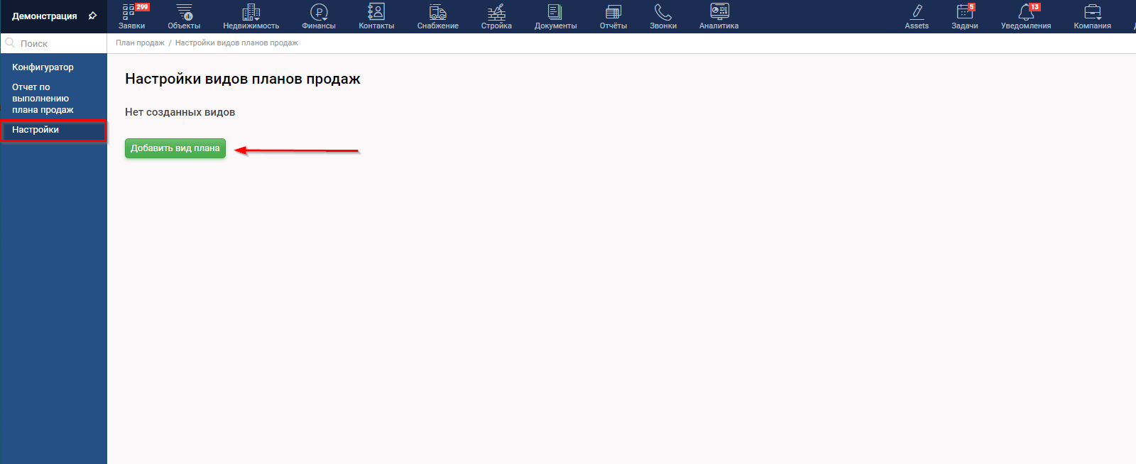 Чтобы начать работу с конфигуратором впервые создайте вид плана в разделе Настройки бокового меню.