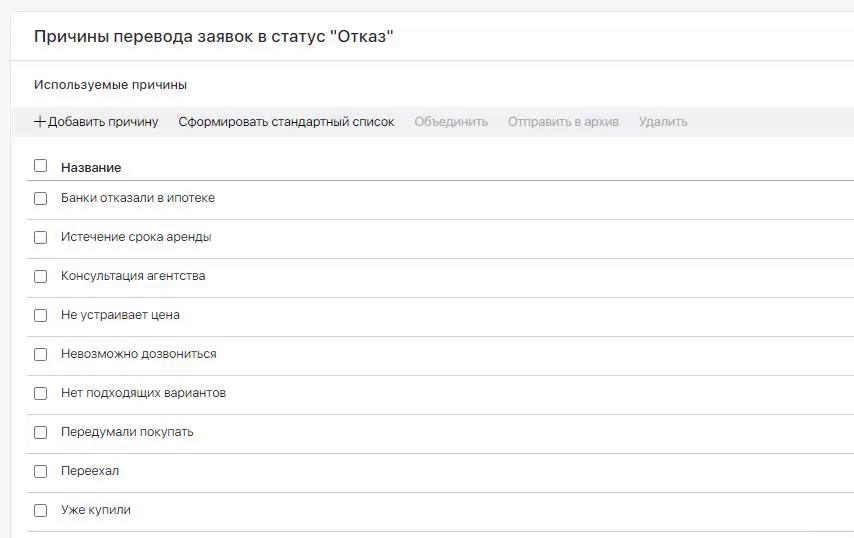 Редактор причин перевода заявок в нерабочие статусы, таких, как Отложенное, Отказ и Нецелевое позволяет выстроить свою собственную воронку по неактивным заявкам.