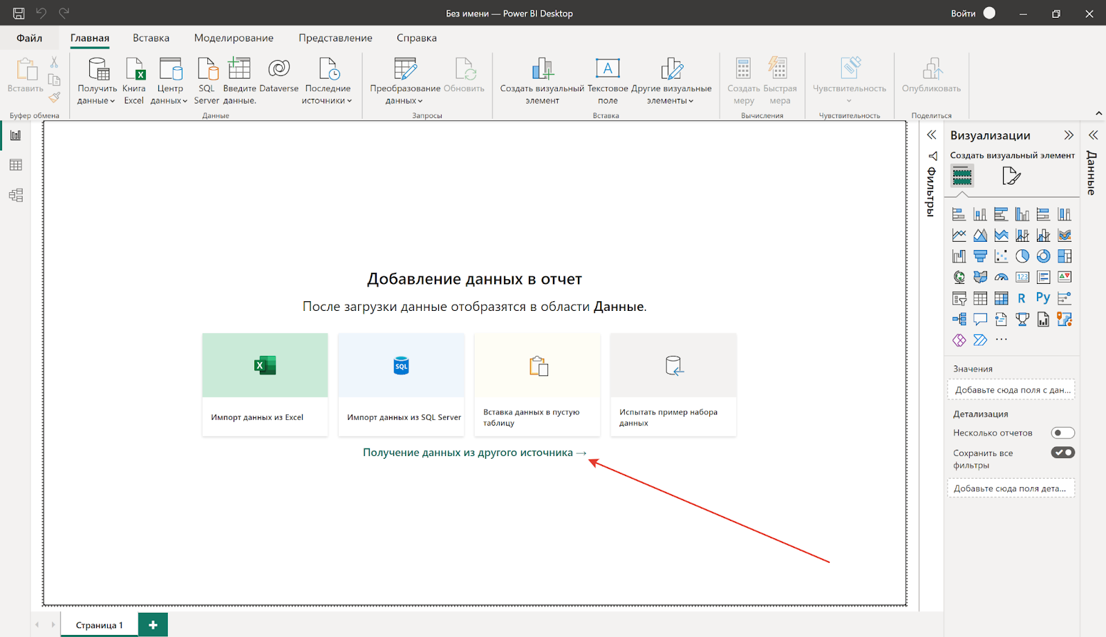 1. Запустите PowerBI Desktop и нажмите Получить данные из другого источника