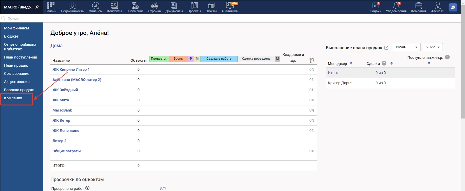 1. На главной странице в меню слева выберите "Компания" и перейдите в список сотрудников