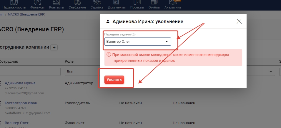 4. Система проинформирует вас, что сотрудник исключен из рядов компании. Все задачи перейдут на заместителя.