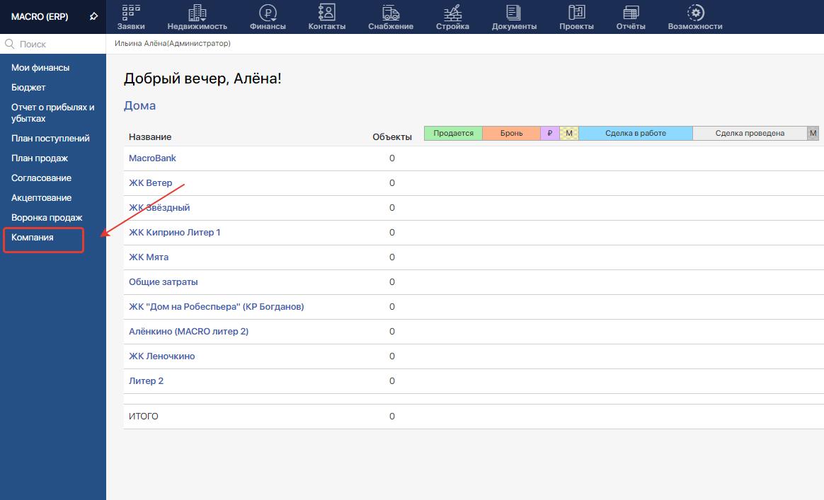 1. На главной странице в меню слева выберите "Компания"