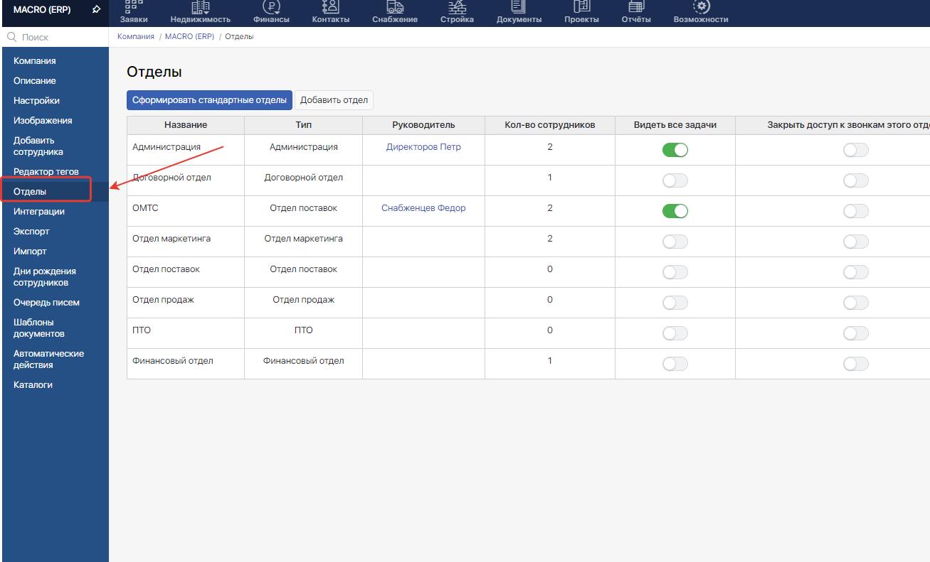 Настройка отделов