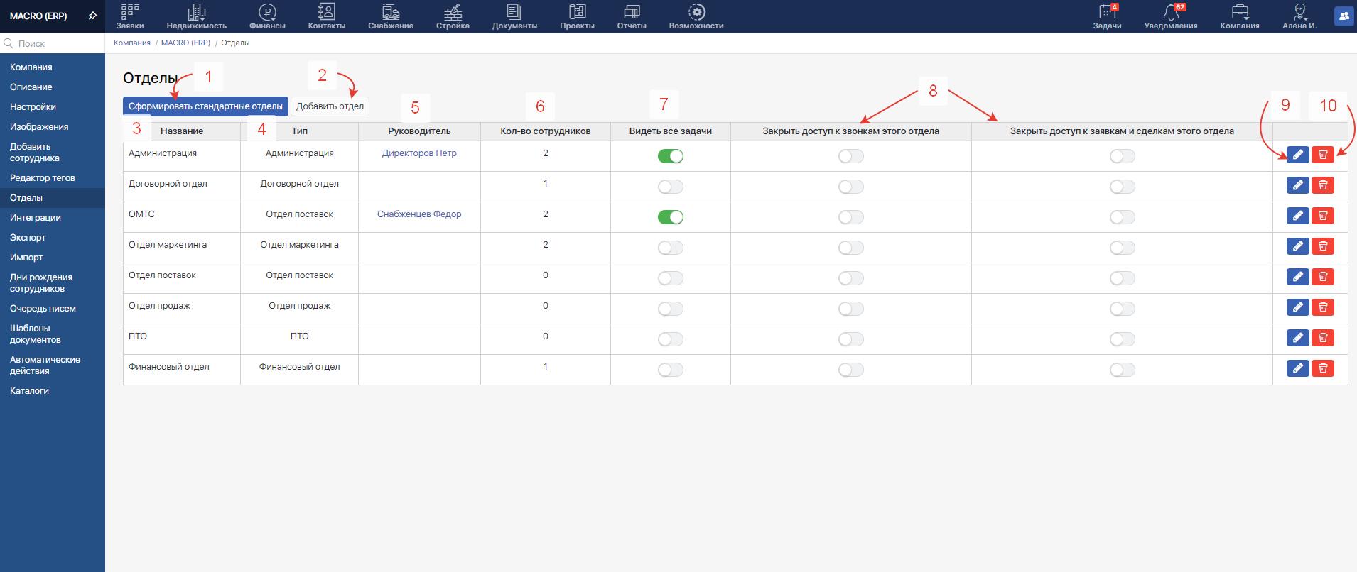 Данные отделы потом можно скорректировать, нажав на карандаш (9)