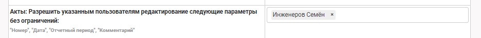 Акты: Разрешить указанным пользователям редактирование следующие параметры без ограничений