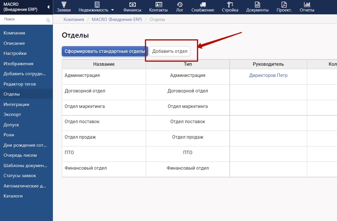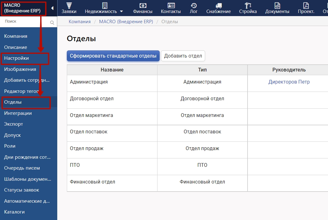 1. Перейдите в настройки компании, выберите раздел "Отделы"