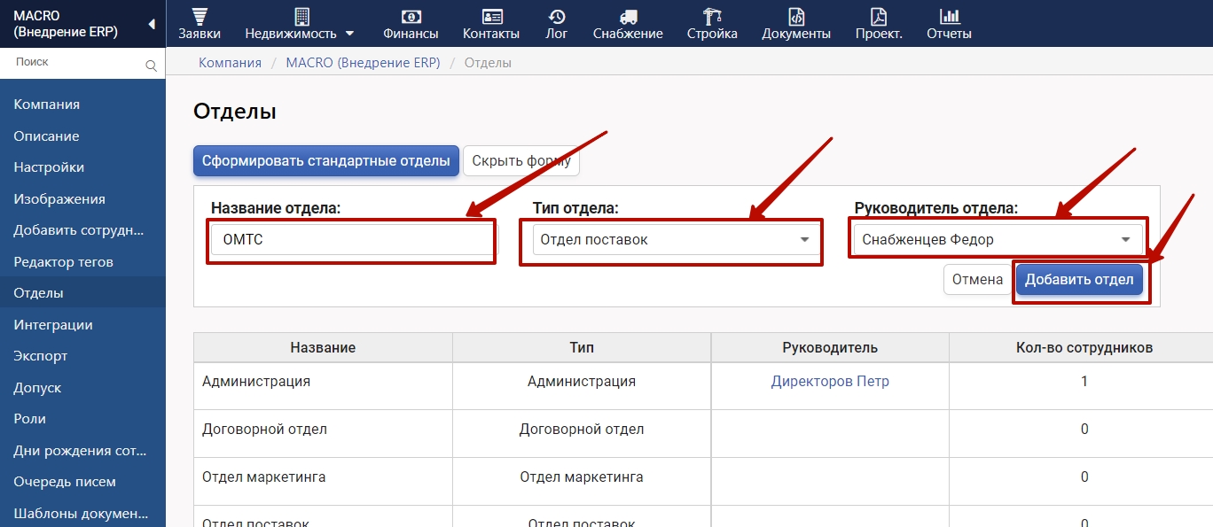 3. Укажите название отдела, выберите подходящий тип, укажите руководителя отдела из перечня сотрудников, и нажмите "Добавить отдел"