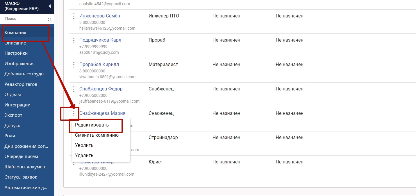 5. Чтобы распределить сотрудников по отделам - перейдите в Компанию, напротив нужного сотрудника нажмите инструмент "Три точки", выберите "Редактировать"