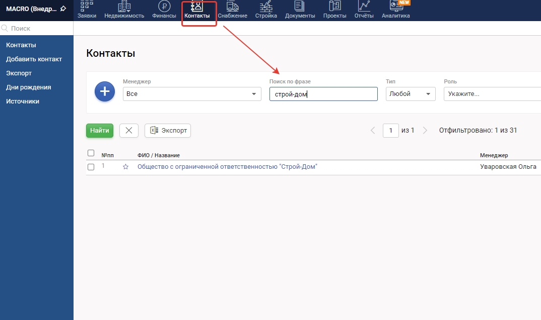 1. Переходим в модуль Контакты и в строке "Поиск по фразе" вводим название контрагента.