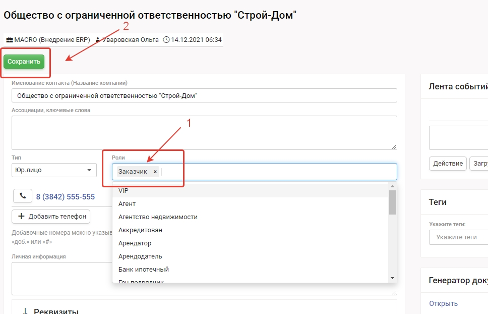 3. В поле Роли выбираем "Заказчик" и нажимаем "Сохранить".