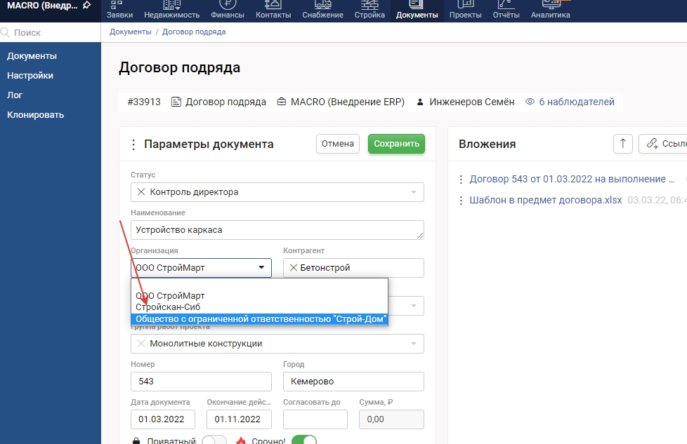 4. Теперь вы можете выбрать данный контакт в качестве Заказчика. Пример: