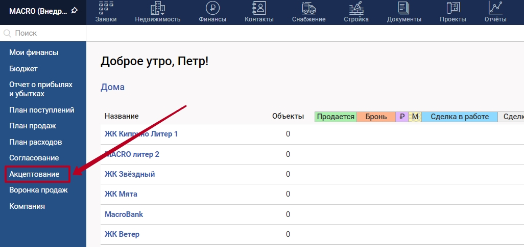 1. На главной странице слева выберите раздел "Акцептование"