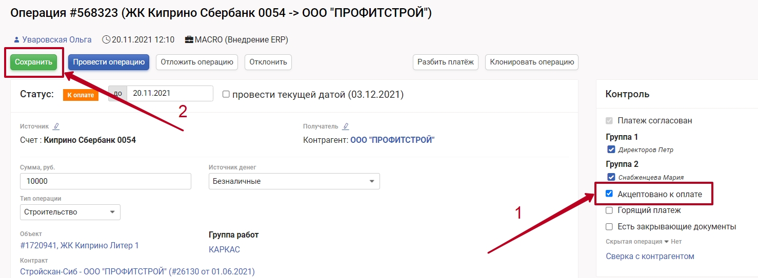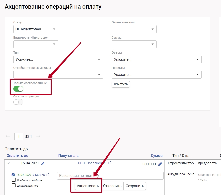 Вы также можете акцептовать финансовую операцию из окна заявки, для этого поставьте галочку напротив "Акцептовать" и нажмите "Сохранить"