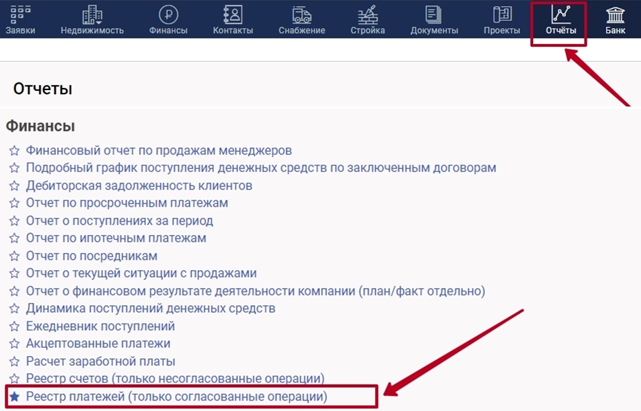 1. Откройте модуль "Отчеты" и в разделе "Финансы" выберите "Реестр плтатежей".