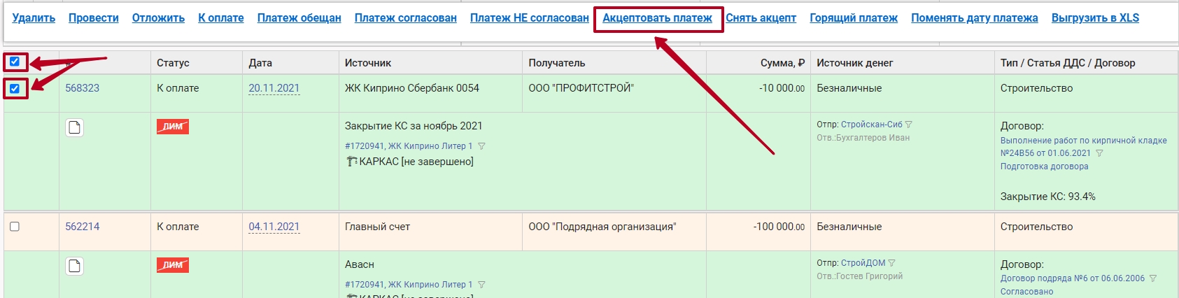 2. Откройте Реестр платежей, для просмотра фин.операций нажмите на ее номер, для акцептования выделите все или несколько позиций галочкой и нажмите в появившейся строке "Акцептовать платеж".
