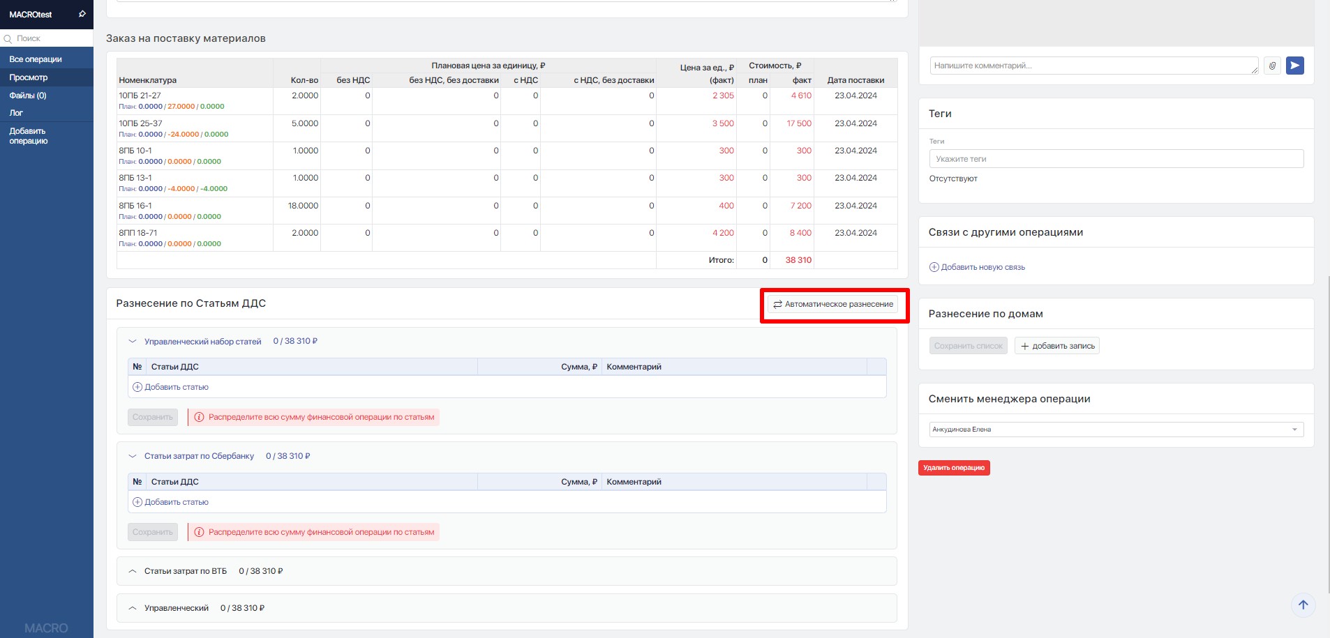 Автоматическое распределение финансовой операции по статьям может быть сделано пользователем принудительно по нажатию на кнопку "Автоматическое разнесение" внутри финансовой операции.