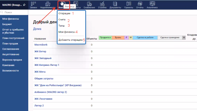 1. Операции - переход в модуль Финансы со списком всех доступных финансовых операций