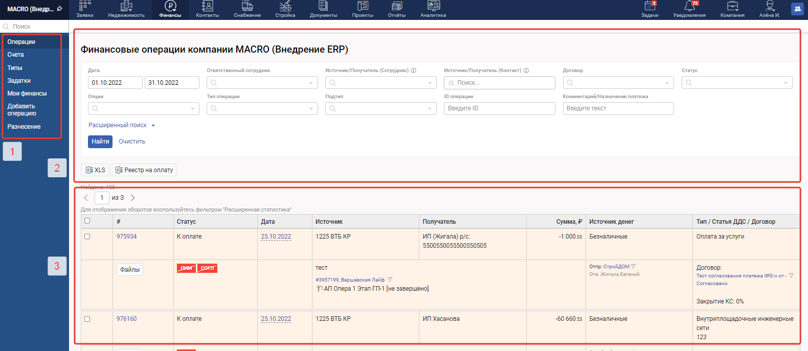 2. Меню фильтров модуля финансы - используется для отображения финансовых операций в соответствии с критериями отбора