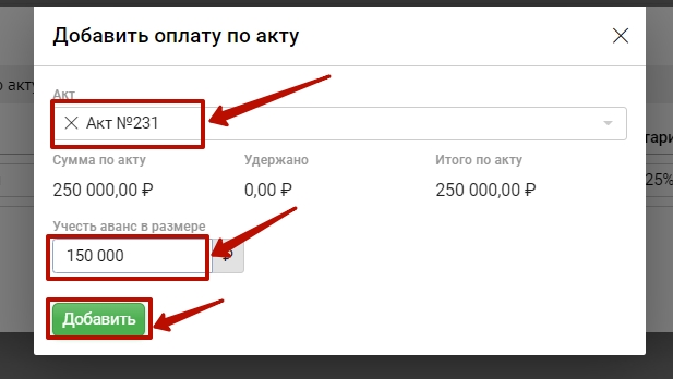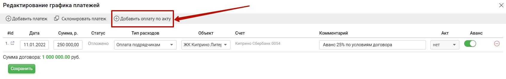 2. При создании платежа по акту нажмите "Добавить оплату по акту"